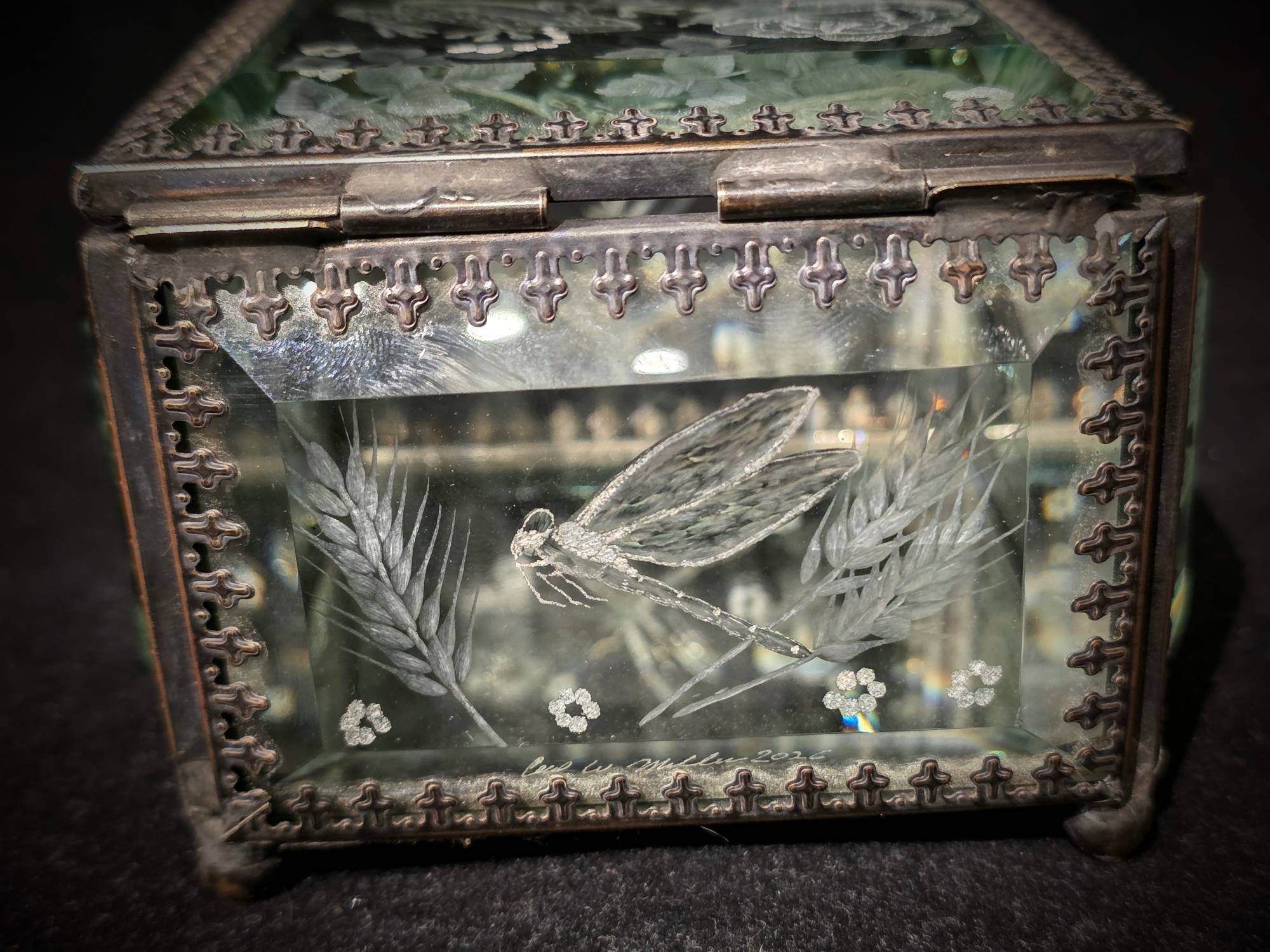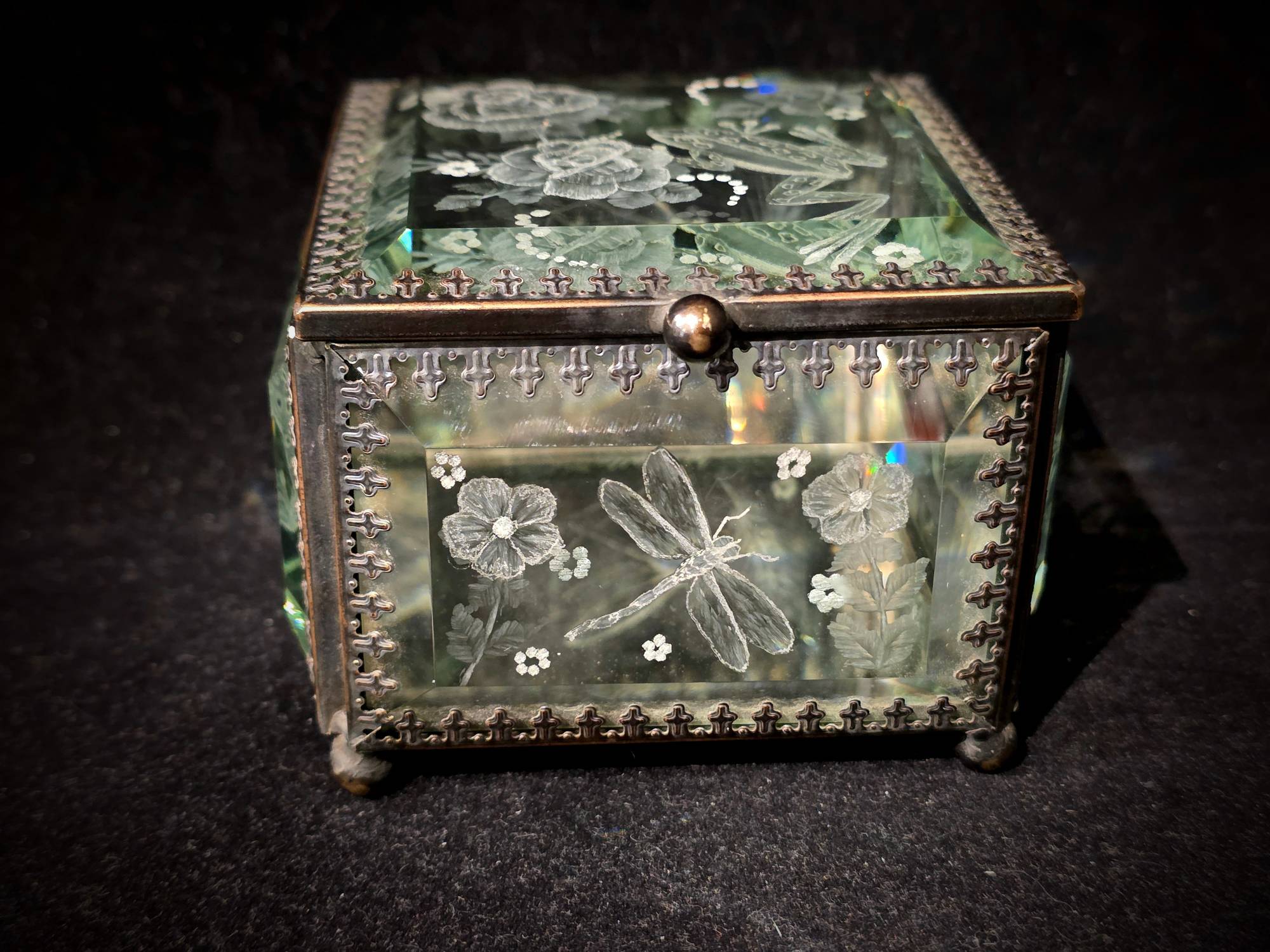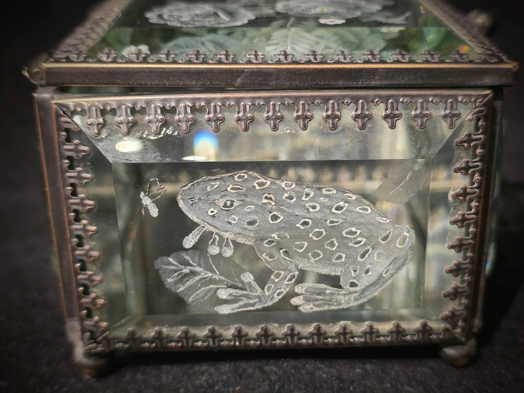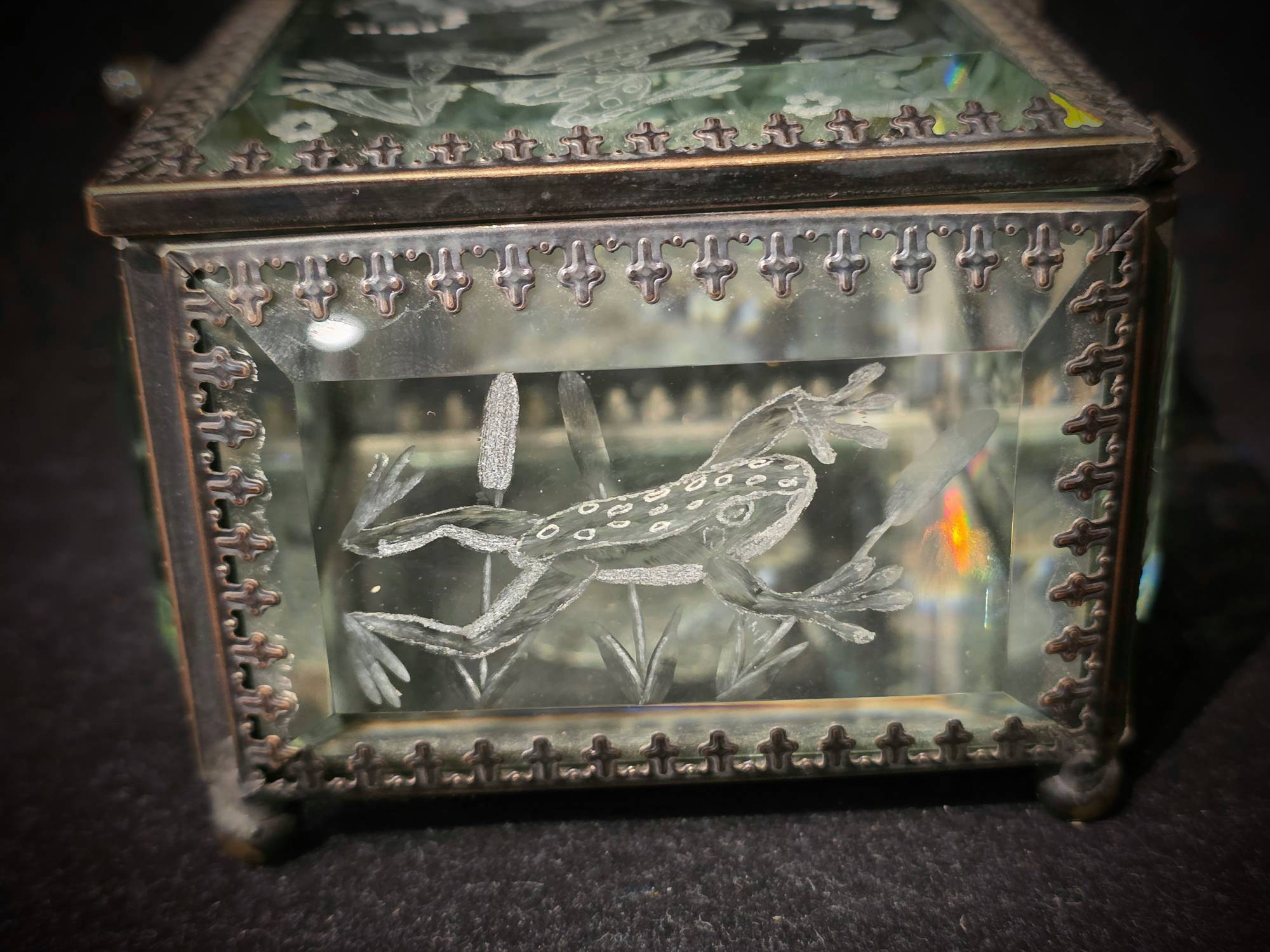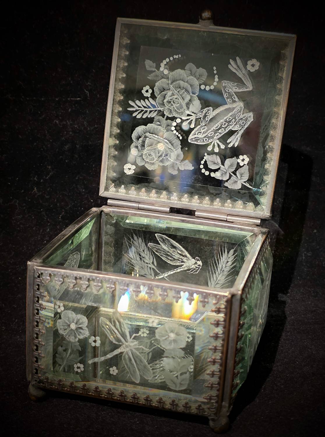 ONE OF A KIND- CUT GLASS PIECE. An amazing Square Mirrored Glass Jewelry Box by our very talented cut-glass artist, Carl Miller. This one-of-a-kind piece has spectacular images of Frogs and Dragonflies and flowers on every side (including designs cut on both sides of the lid for that added depth) - showing the skills of his ability to cut, polish and shade to create a stunning piece. This beautiful small, hinged, mirrored glass box (with a swirling knob) is a square shape made with clear glass panels with faceted front sides. Plus, it has a mirrored interior base and a silver-metal trim accenting the edges for a stunning, beautiful finish.